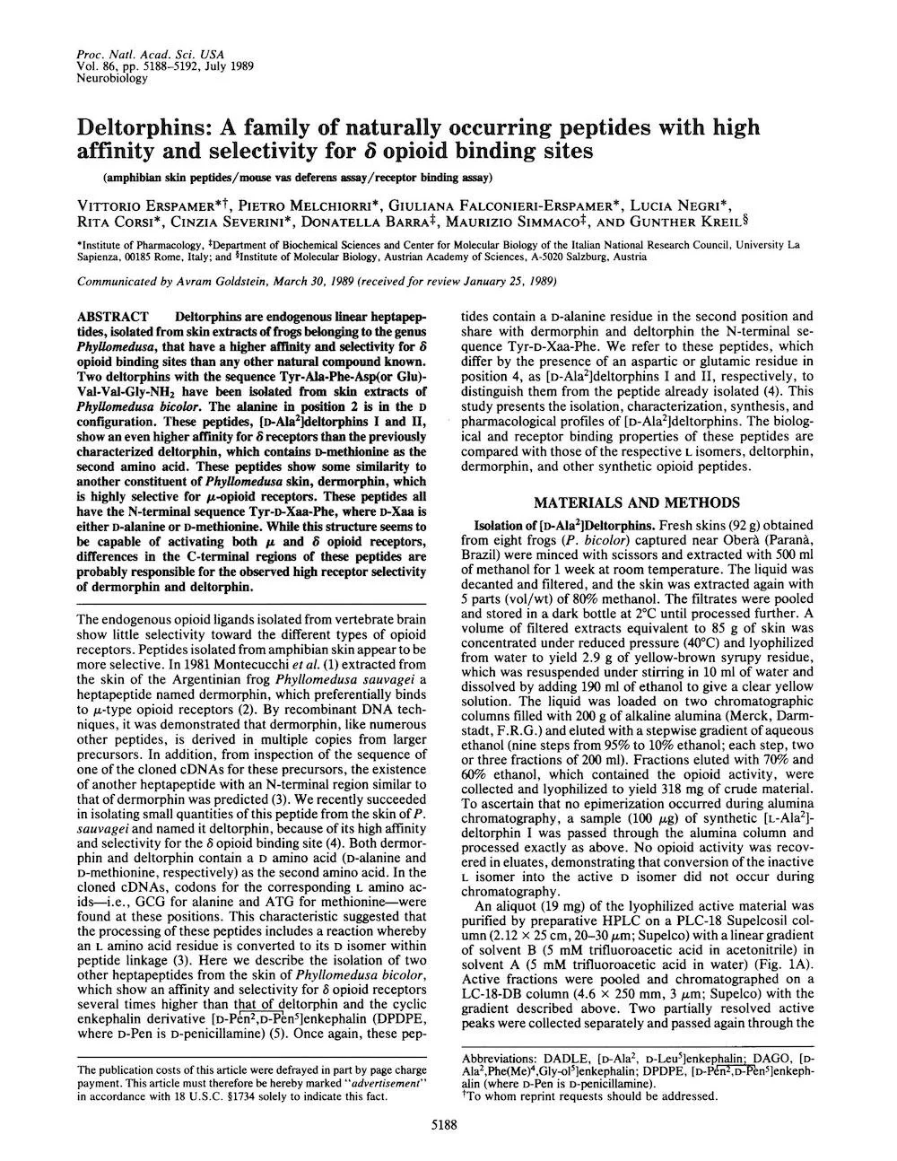 Deltorphins are endogenous linear heptapeptides, isolated from skin extracts of frogs belonging to the genus Phyllomedusa, that have a higher afinity and selectivity for opioid binding sites than any other natural compound known.